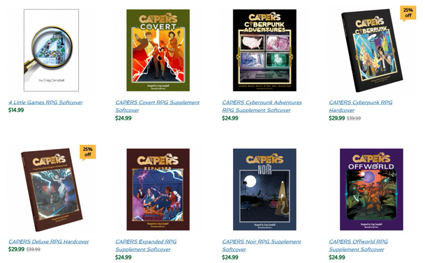 CAPERS, CAPERS Cyberpunk, Good Strong Hands, and Code Warriors hardcovers are 25% off; that's just $29.99.